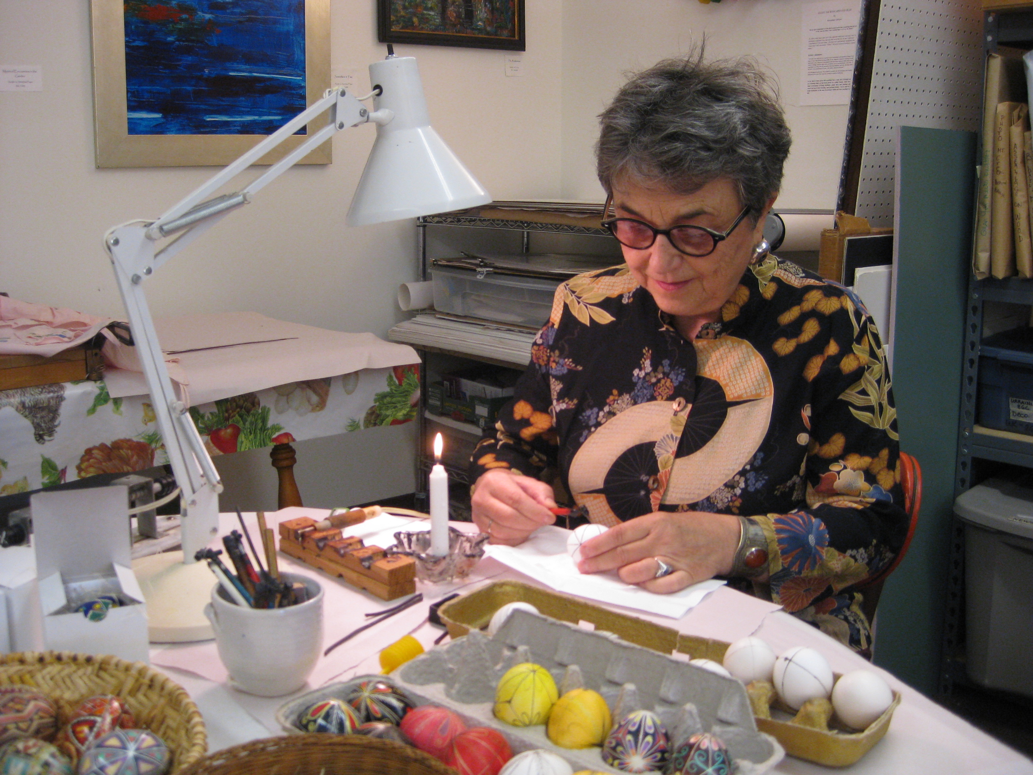 I look forward to the California spring when my chickens supply me with an abundance of eggs that I carefully gather from their nesting box to decorate. Using a tiny egg pump I carefully remove the contents and apply melted wax with a fine tool and liquid dye to create patterns that have a message. I am thankful to my relative for teaching me this heartfelt tradition as a young age.