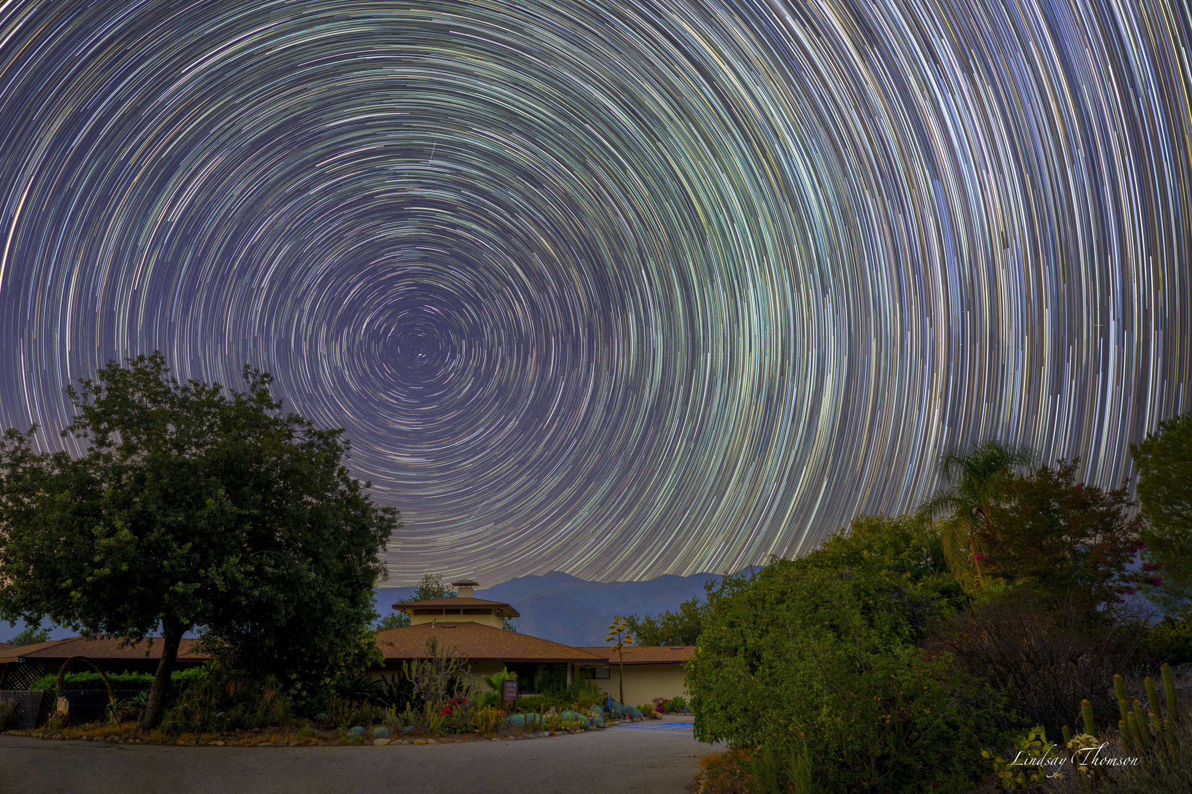 The skies above the Topa Topas are fairly dark. Dark enough to view many of the stars in the night sky. Over 300 images were stacked to create this star trail image. The Beatrice Wood Gallery serves as a perfect foreground for star trails above the East End/Upper Ojai. As the Earth rotates, it seems like the stars rotate around the North Star, Polaris right above Chief Peak and directly above the gallery.