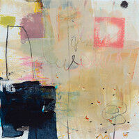 “The layers I create represent engagements in a tactile way. Each piece is built with coats of paint, mark making with pencils, chalk pastels, pens and texture using paper scraps. I work on several pieces at the same time so a dialog is created, a conversation happening between the paintings that serve to create a story and allow thoughts to coalesce.”